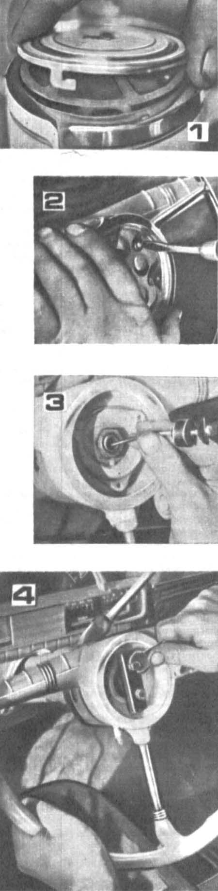 Механизм расположен под рулевым колесом. Сначала надо снять декоративную крышку. Для этого, слегка нажав на нее и повернув вправо, освободите три уса, которыми она удерживается (фото 1). Теперь очередь кольца включателя сигналов. Удерживая кольцо сверху левой рукой (2), осторожно, чтобы в последний момент пружина не вытолкнула и не разбросала все детали, выверните три винта. Конечно, прежде чем приступить к разборке, вы сняли “массовый” провод аккумулятора или вынули предохранитель цепи- вставку №1 (иначе сигнал будет срабатывать от любого прикосновения). Еще одна операция перед демонтажем рулевого колеса: выньте провод сигналов (3), отсоединяя его вначале от реле включения и сжав пассатижами или отлаяв наконечник. Последнее необходимо для облегчения оборки после ремонта. Гайку, которой крепится рулевое колесо, удобнее всего отвернуть торцовым ключом “на 24”. Если у вас его нет, можно воспользоваться изогнутым ключом для масляного фильтра.